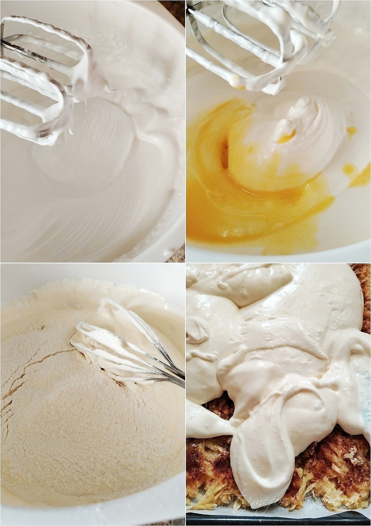 • Meantime, prep the batter. Separate the whites and mix them with a pinch of salt until fluffy. Add the sugar in 3 batches and continue mixing until a strong meringue is forming (4-5 minutes).