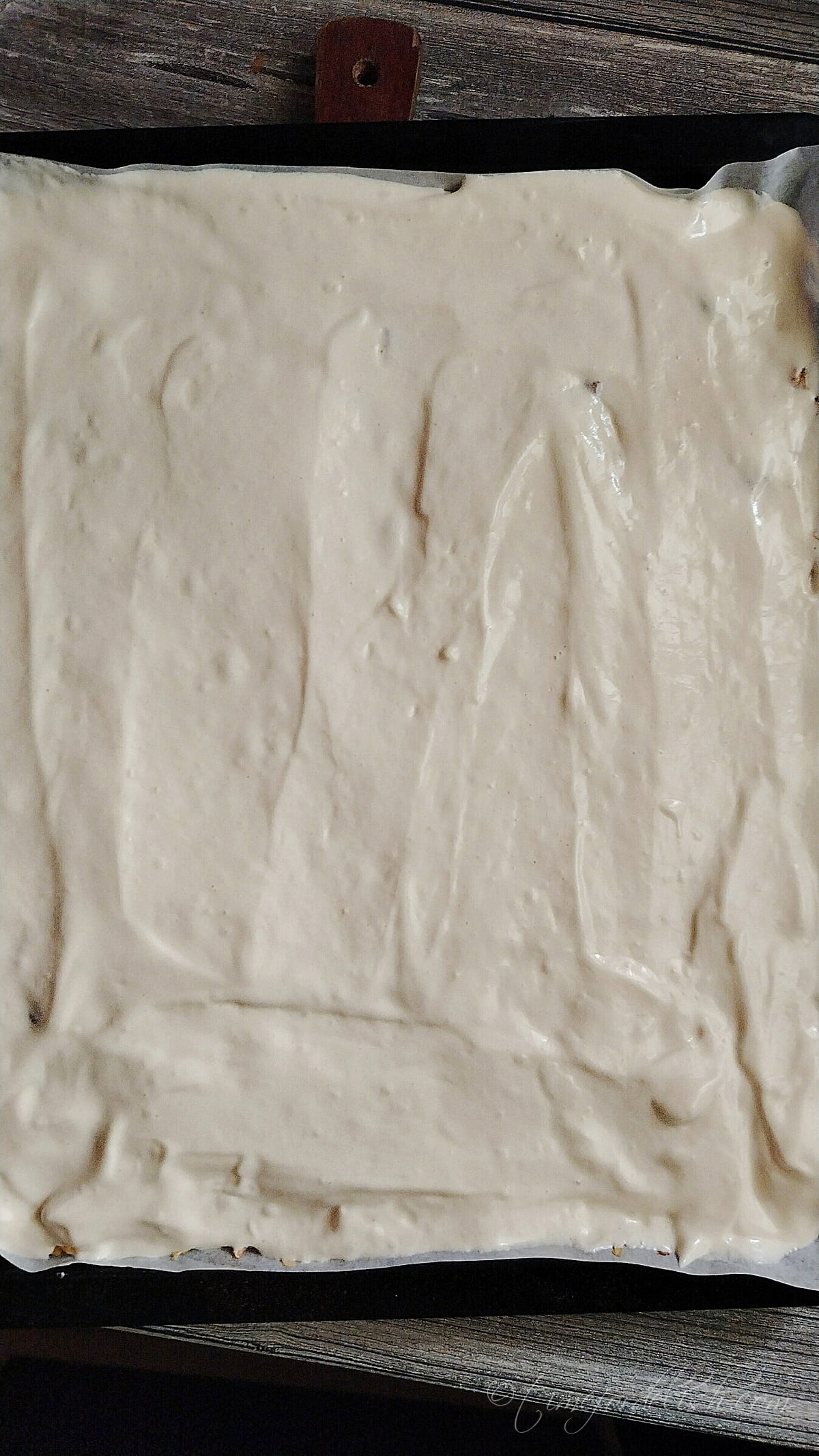 Take out the apple tray from the oven and spread over the batter mixture. Level well and continue baking 15-20 minutes until light brown.