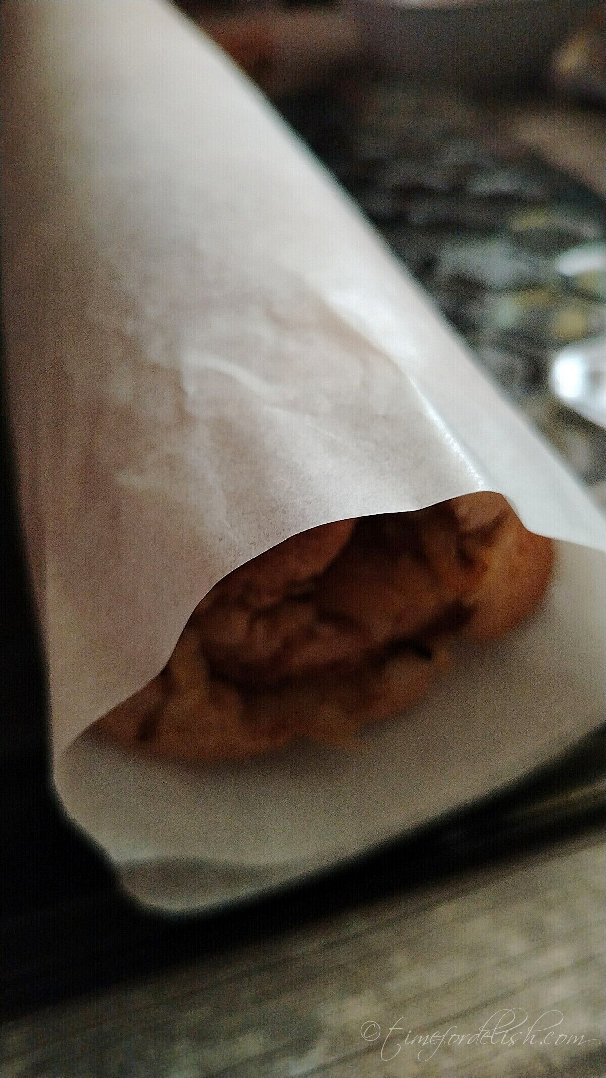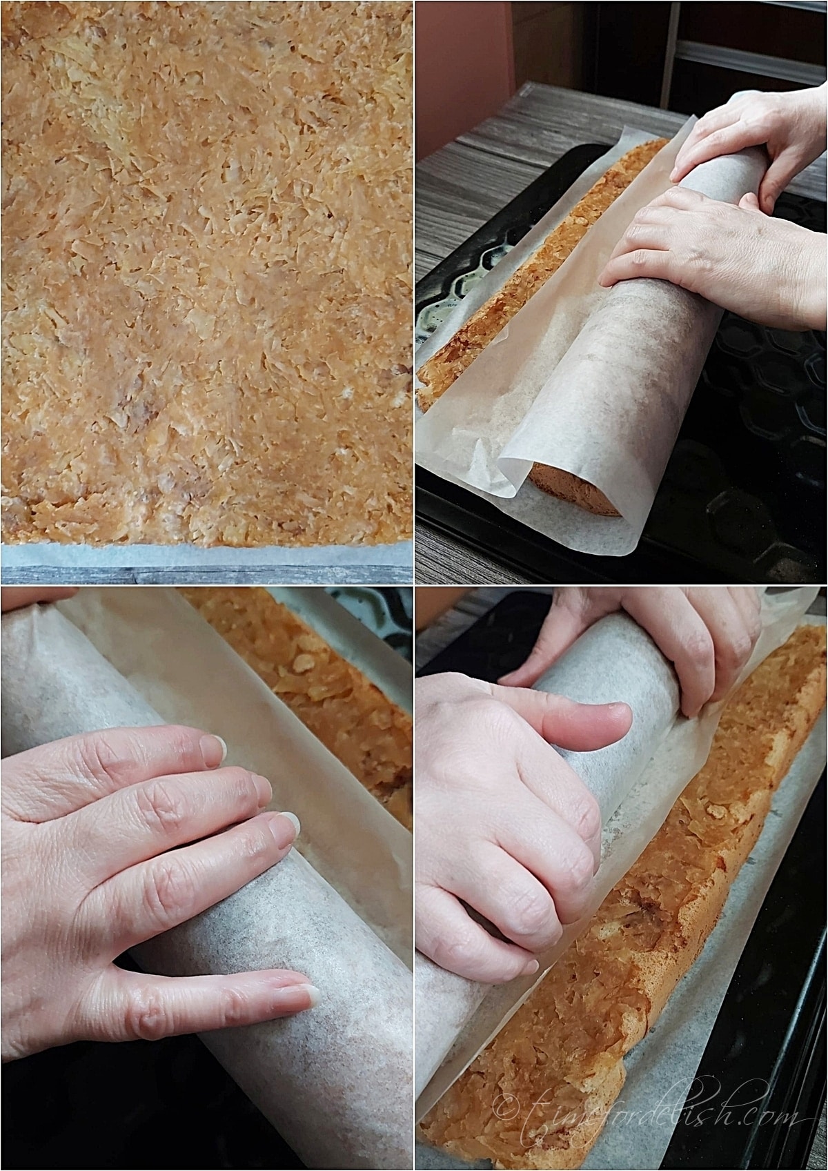 • Take out of the oven and place another parchment paper on top of it. Flip the sheet cake and remove the initial paper. Roll it up onto itself and finish wrapping it with the new paper. Let it cool about 1hour or so.