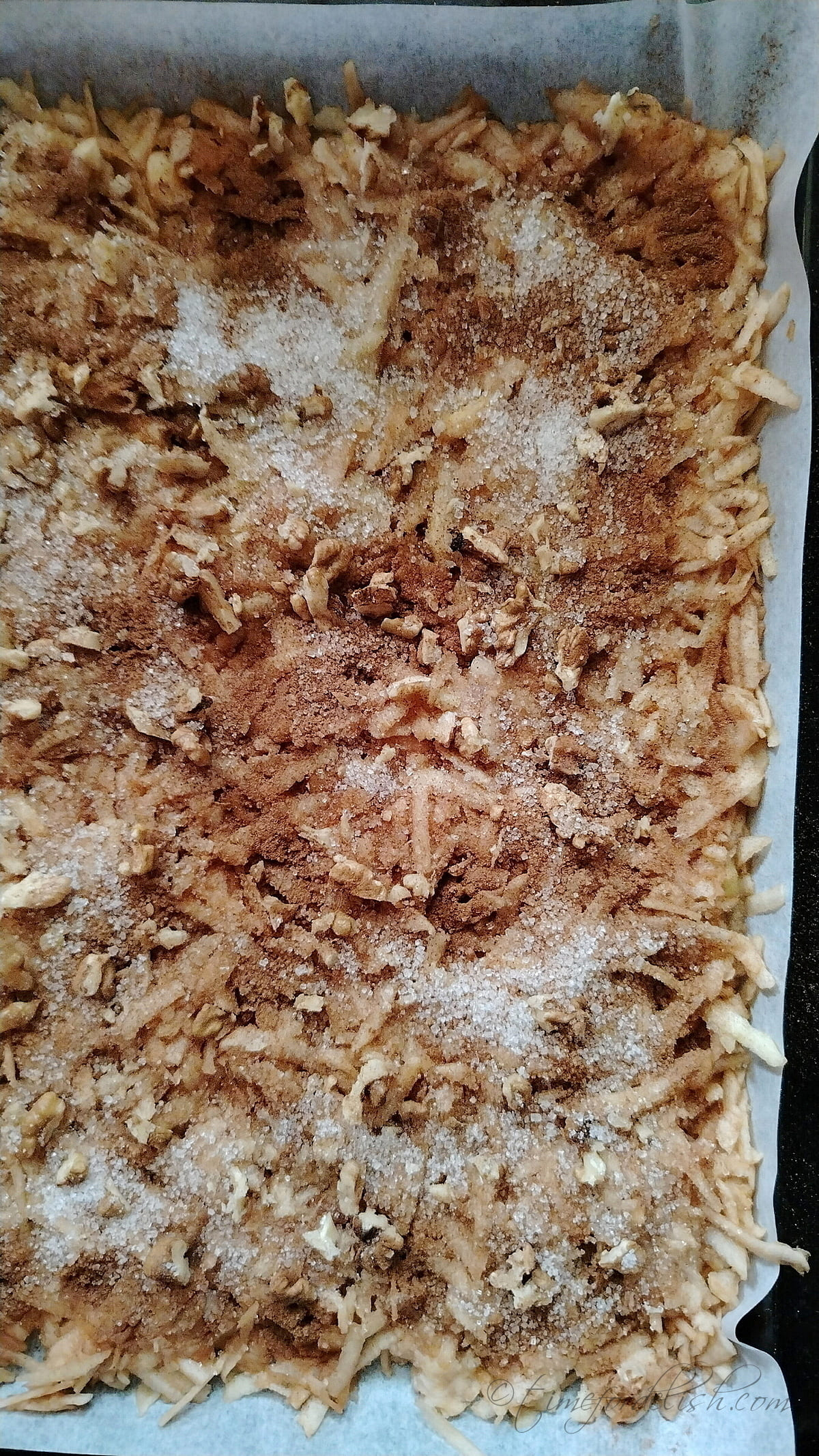 • Rinse and peel the apples. Grate them and prepare a oven baking tray lined with parchment paper. Transfer the apples in batches after squeeze them with your hands to release the excess juice.