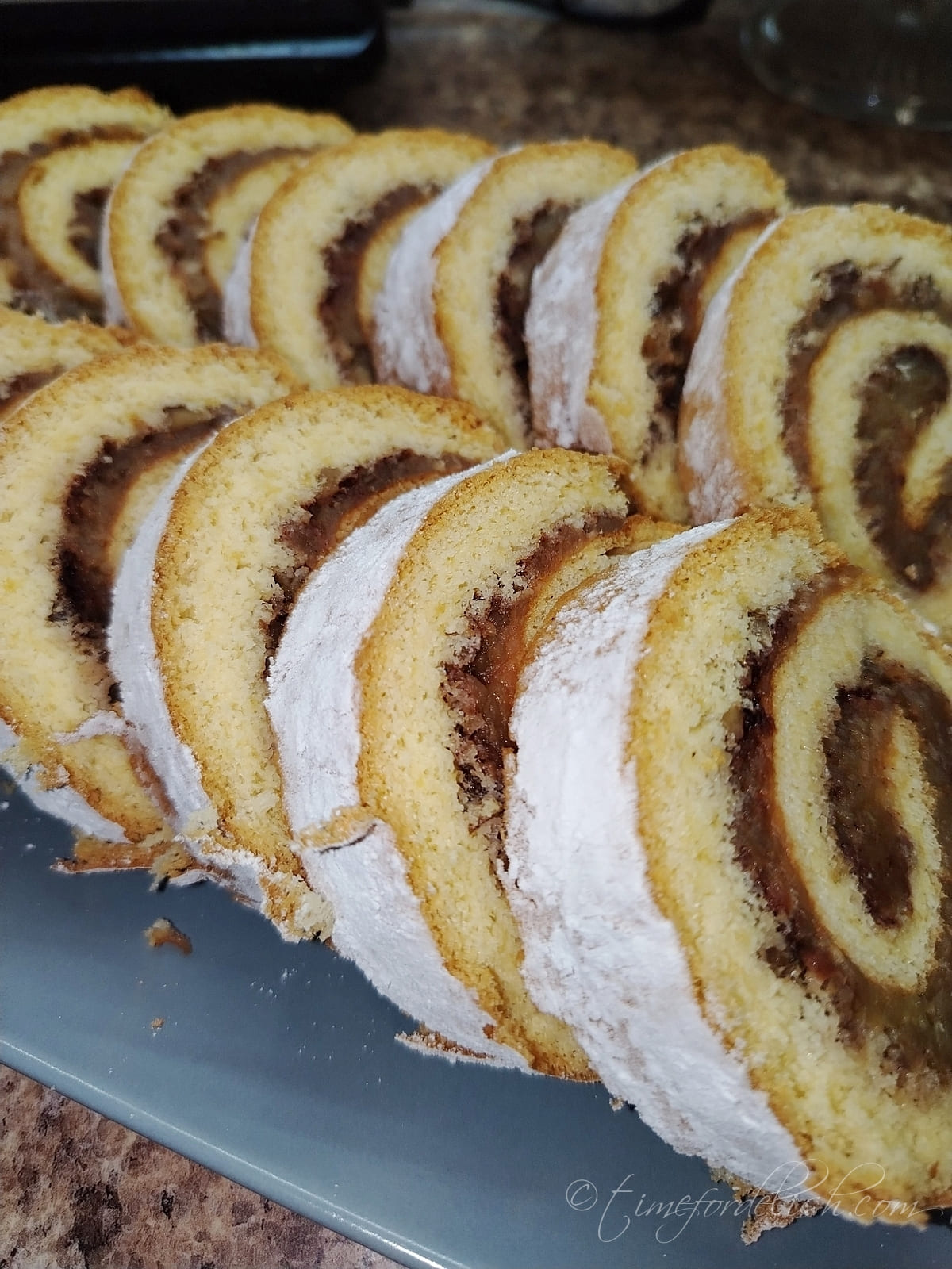 Unwrap the roll cake and sprinkle with icing sugar. Slice and serve. Enjoy!