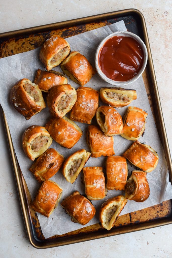 All you need is a pre-rolled sheet of puff pastry, a packet of sausage meat and a few things from the cupboard and the fridge to jazz things up a bit before assembling the sausage rolls with the help of a bit of egg wash, slicing them up and baking. Go to recipe.