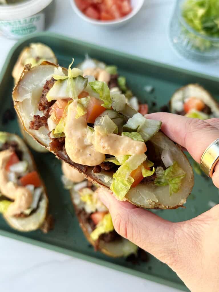 These Big Mac Potato Skins are a more wholesome twist on the traditional Big Mac. They make the perfect game day appetizer, snack or a fun weeknight dinner! Forget traditional potato skins – these babies are stuffed with all the delicious flavors of a Big Mac, including juicy beef, creamy burger sauce and crisp lettuce. Go to recipe.