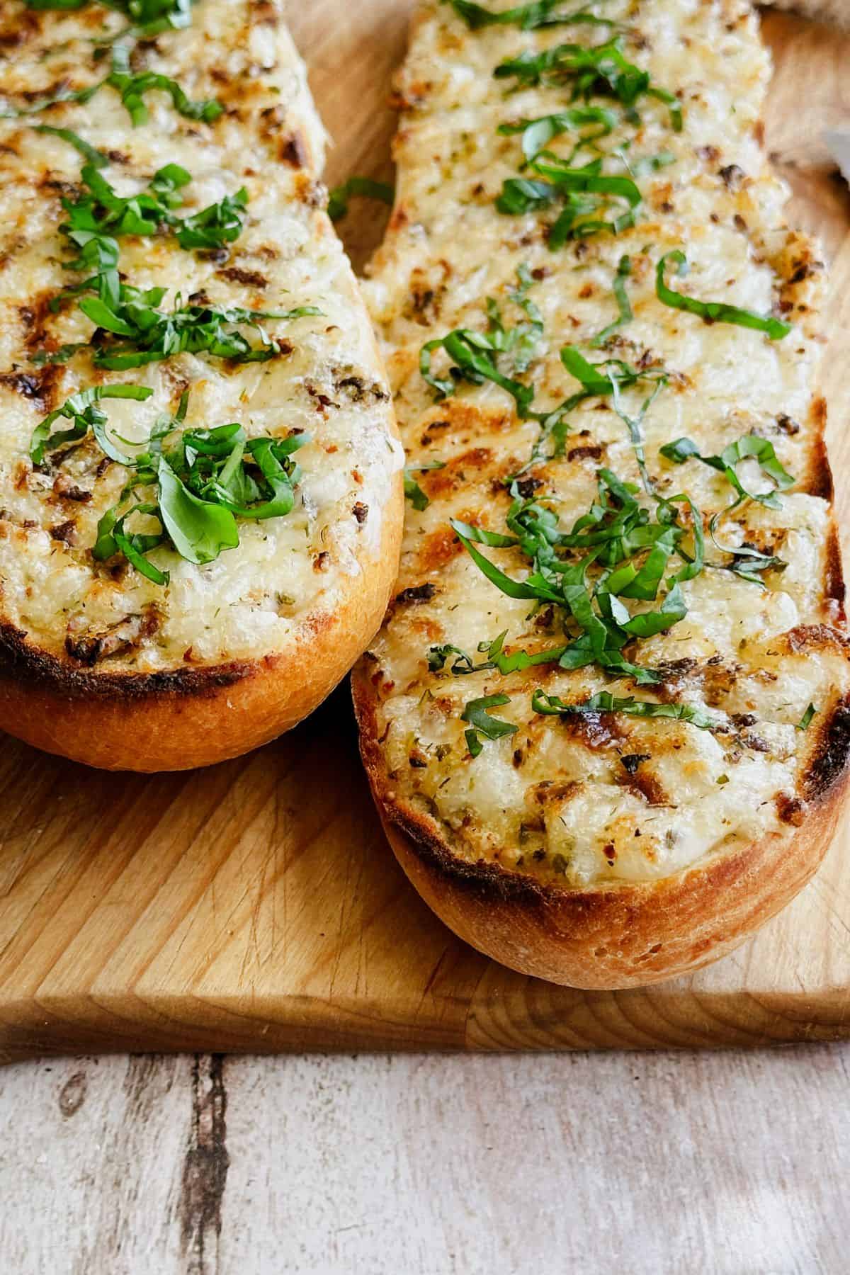 This easy Vegan Cheesy Bread is golden, bubbly, and loaded with flavor. A crusty French loaf gets slathered with a creamy spread, then finished with fresh basil. Go to recipe.