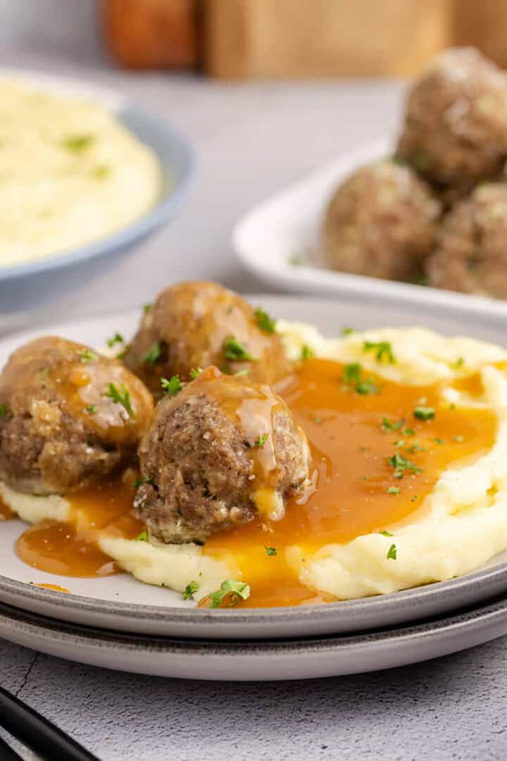 Tender and juicy meatballs sit atop fluffy, buttery mashed potatoes, and are topped with savory gravy and fresh herbs. Your search for tonight’s simple, family-friendly dinner recipe ends here! Go to recipe.