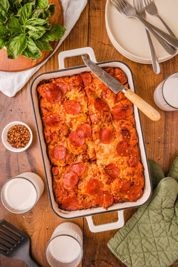 Bubble Up Pizza Casserole is a cheesy, family-friendly dish made with biscuit dough, pizza sauce, gooey melted cheese, and all your favorite toppings baked together until bubbly. It’s quick to throw together and gives you all the flavors of pizza in cozy casserole form. Go to recipe.