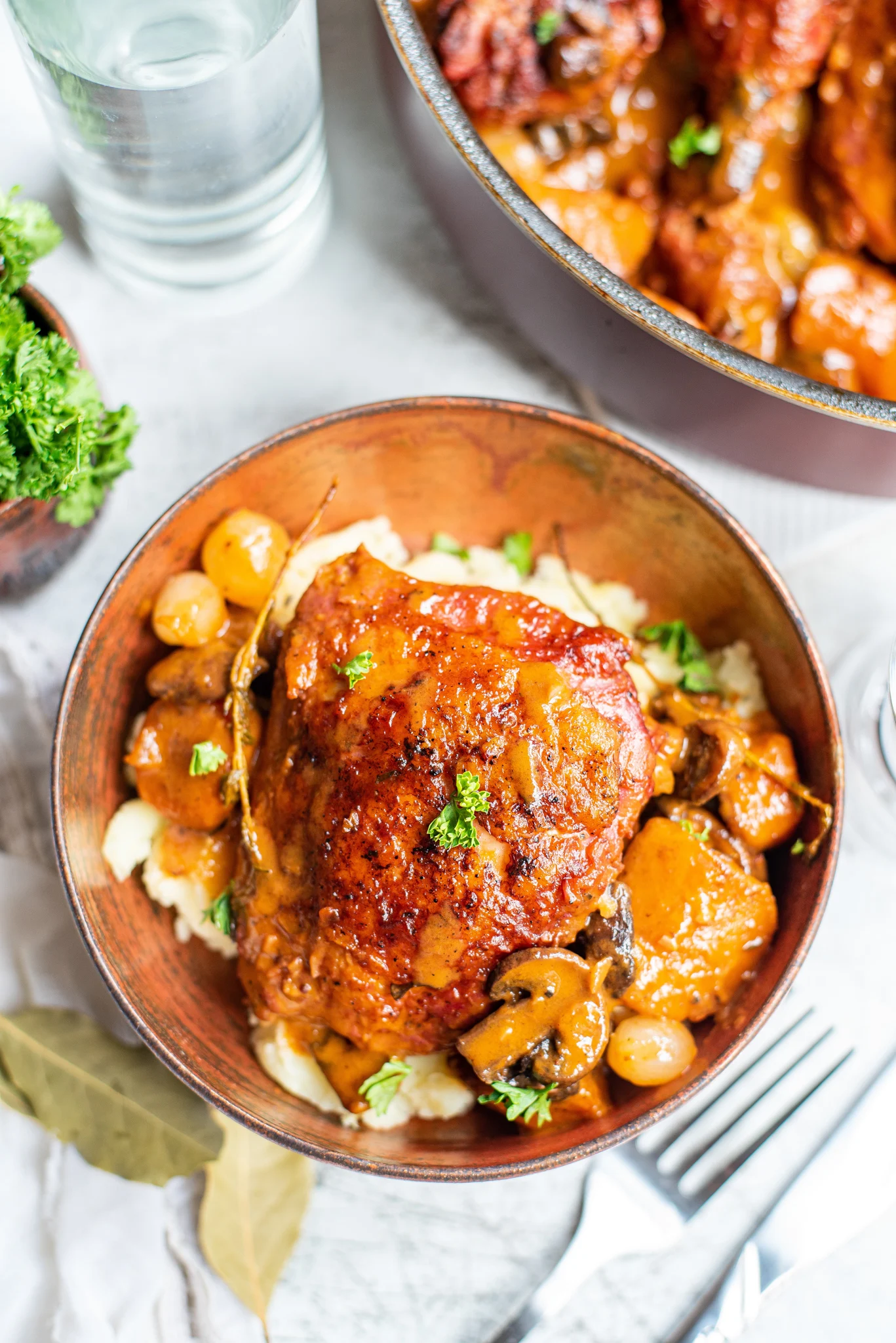 This Coq au Vin Recipe has rich, earthy, aromatic flavors. Bone-in chicken slow simmers together with carrots, onions, mushrooms, bacon, red wine and fresh herbs to create the perfect comforting meal. Go to recipe.