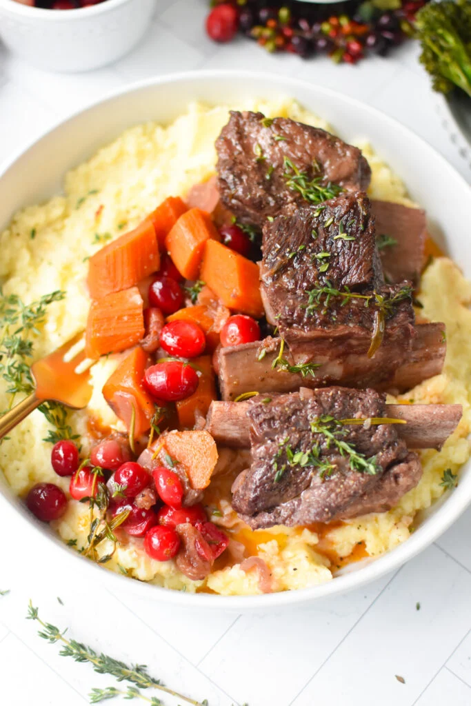 This Cranberry Braised Short Ribs Recipe is a festive, comforting holiday meal that your guests will love. Shorts ribs are braised in a beef broth, red wine liquid with fresh herbs and vegetables along with sweet fresh cranberries.