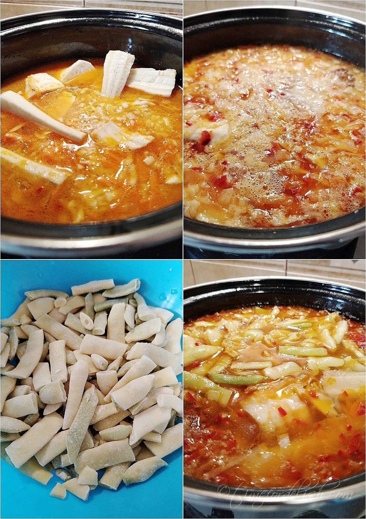 - Wash and prep the veggies. Chop the onion and red pepper. Grate 1/3 of the root vegetables - cut the rest into big chunks.Heat the oil into a large pot and sauté the onion until translucid (4-5 minutes). Add the red pepper and the grated veggies. Cook together another 3-4 minutes.Rinse the meat and cut it into small pieces. Add to the pot and cook for a few minutes more. Add a gallon of water to cover everything. Add the salt, the rest of the vegetable pieces and stir.Cover partially and let the soup simmer for about 30 minutes.