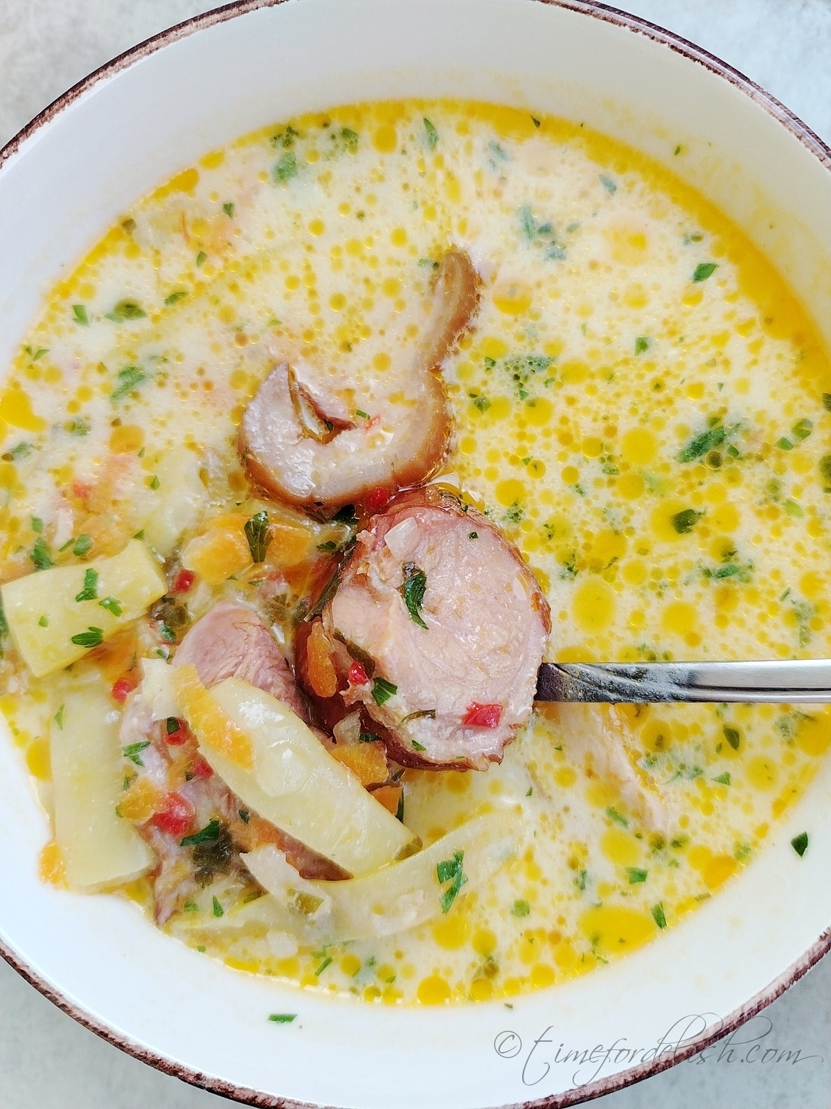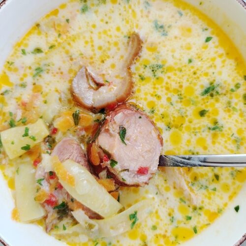 We eat lots of smoked pork meat, but especially smoked pork knuckle is most enjoyed in soups. It gives a strong, satisfying flavor and when paired with the creaminess of sour cream…