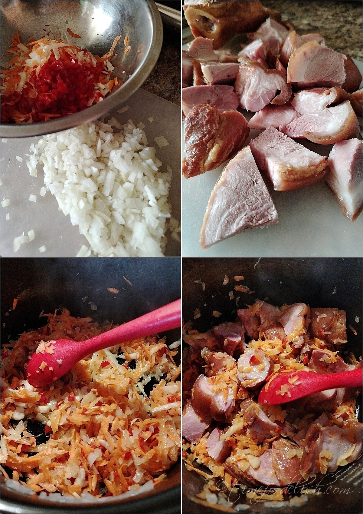 Rinse the meat under running water, then chop the pork knuckle in small bites. Add them to the pot. Cook together a couple of minutes then add water to cover everything well (up to a gallon).