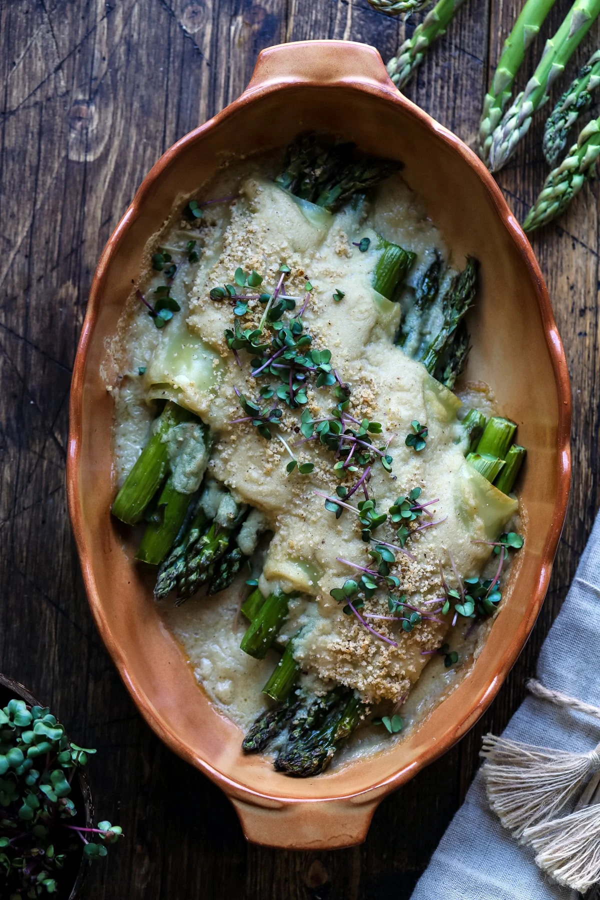 Enjoy a delicious vegan cannelloni recipe featuring asparagus wrapped in lasagna sheets and baked with creamy vegan béchamel sauce, and a sprinkle of vegan parmesan. Perfect for a delightful spring or Easter dinner side dish! Go to recipe.