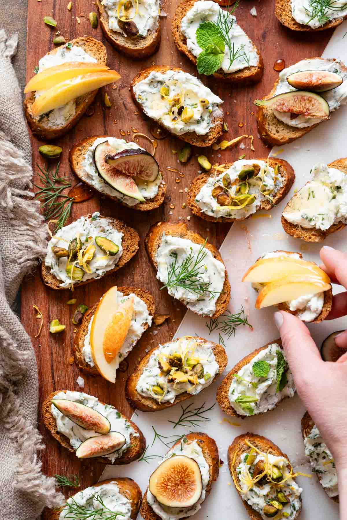 Perfect idea for Easter appetizers! Creamy goat cheese is mixed with fresh herbs, olive oil and lemon juice, then spread on crispy toasted bread. And, with so many topping possibilities, you can really make this easy appetizer your own! Go to recipe.