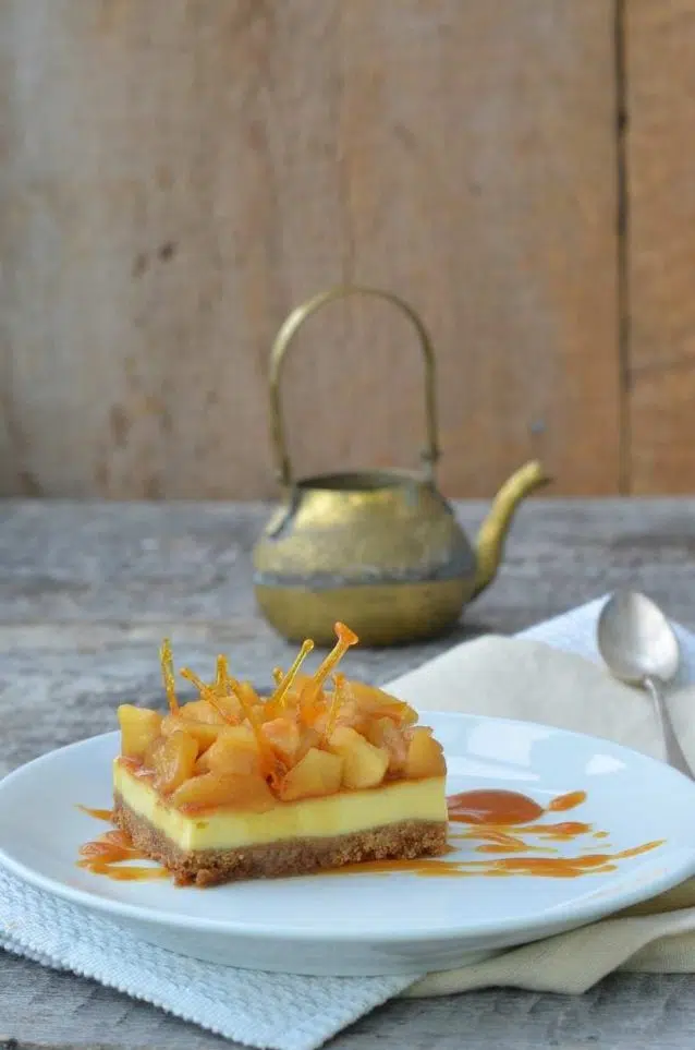 This apple custard tart is a sweet, comforting dessert with complementary textures and great flavours. You’ll get a crisp shortcrust pastry case, a creamy, smooth-set custard, semi-soft cinnamon apples and a sweet apricot glaze. Go to recipe.