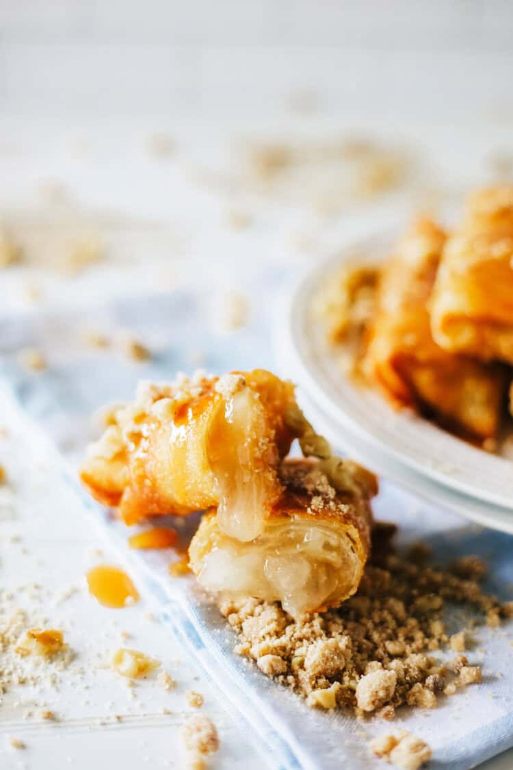 Freshly cut apples are simmered in a brown sugar cinnamon combo and then tucked into puff pastry pockets. Theyโre baked until golden and flaky. Go to recipe.