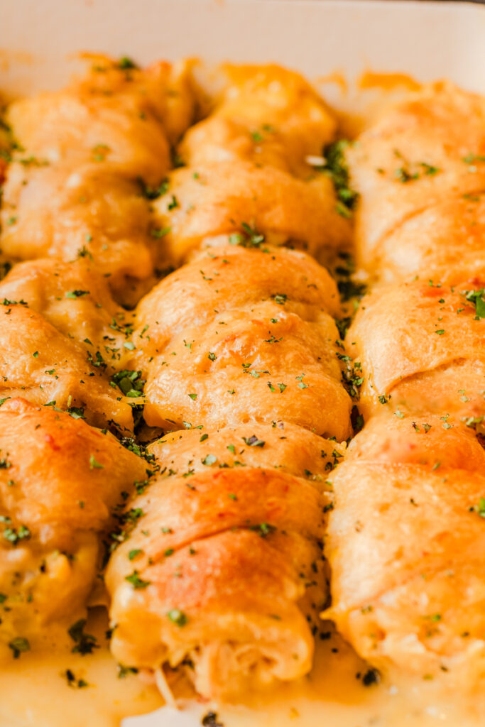 These Cheesy Chicken Crescent Rolls require only a few simple ingredients and are packed with flavor! Each crescent roll is stuffed with shredded chicken, cheese, and seasonings! Topped with a creamy, cheese sauce…this chicken rolls recipe is one you don’t want to pass up! Go to recipe.