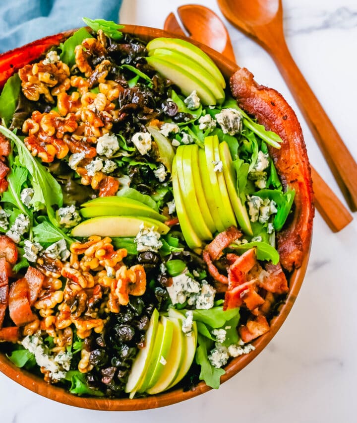 Fall Harvest Salad made with fresh apples, candied walnuts, dried cranberries, feta or blue cheese, crispy bacon all tossed with arugula or spring mix in a homemade apple cider vinegar dressing. Go to recipe.