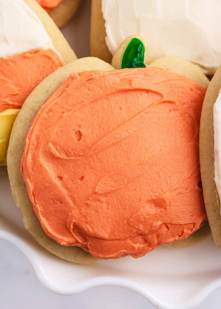 These pumpkin cut-out cookies are a fall twist on a classic sugar cookie! Use pumpkin cookie cutters to cut the soft sugar cookies into shapes then decorate with icing. Go to recipe.