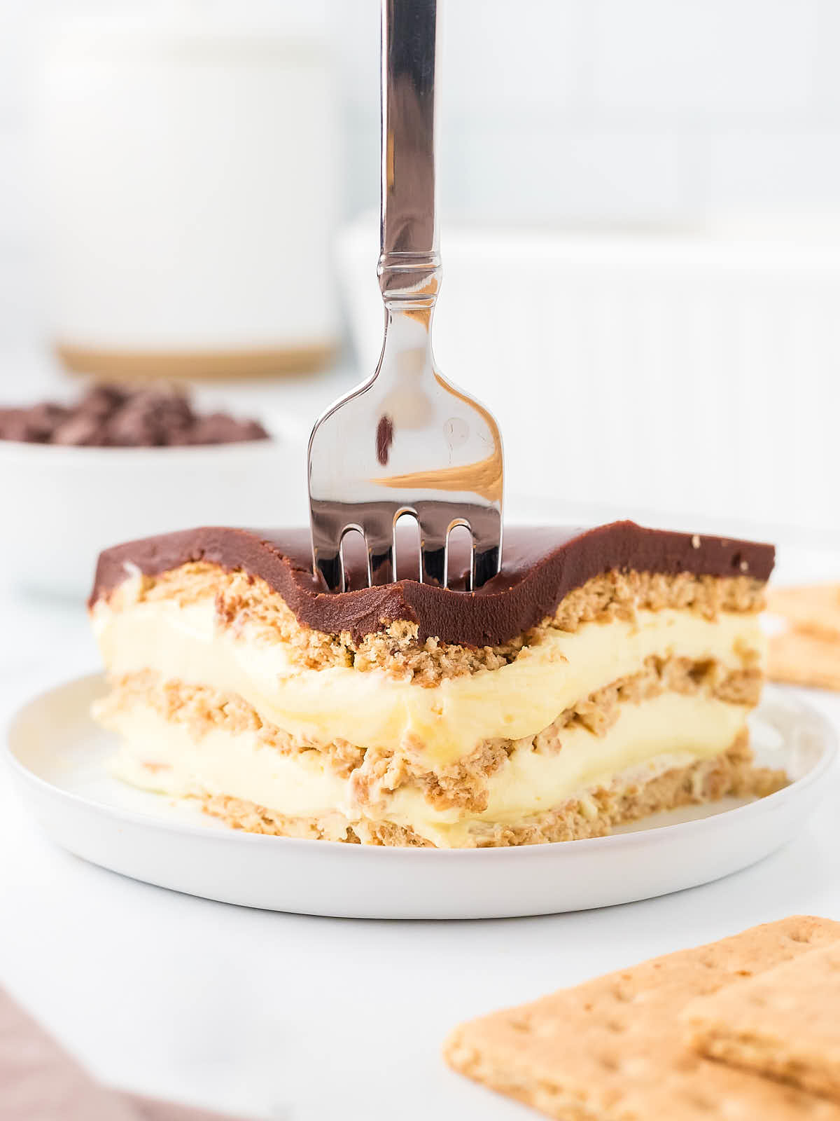 Eclair cake is an easy, no-bake dessert that layers creamy vanilla filling with crisp graham crackers and a rich chocolate ganache, using instant pudding, whipped topping, and graham crackers for a treat that’s as simple to make as it is delicious to eat, and after some chill time, the flavors come together into a smooth, decadent cake reminiscent of a classic eclair. Go to recipe.