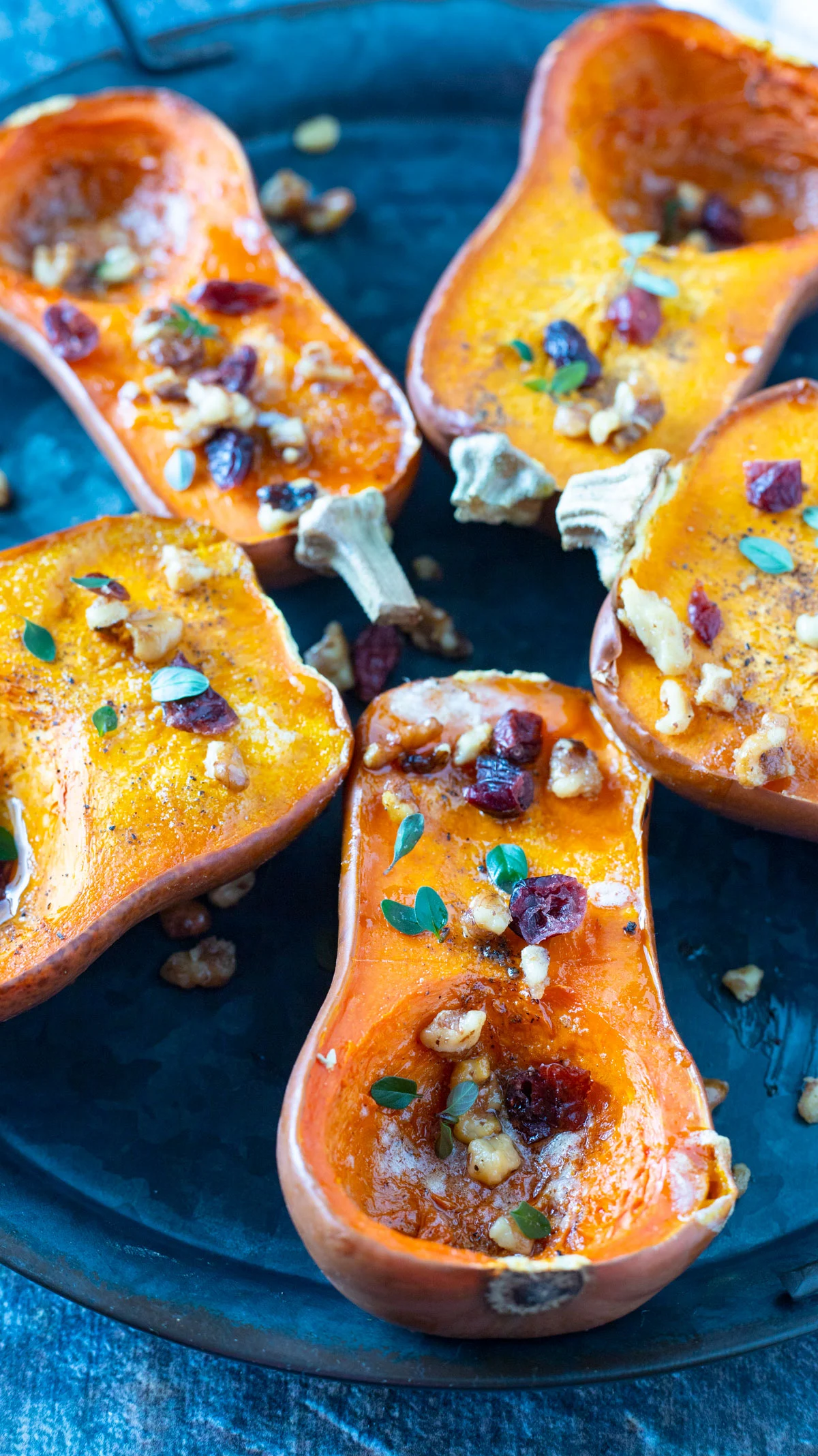 This stuffed acorn squash is packed with fall flavors and ingredients. These roasted fall veggies make the perfect side dish! Go to recipe.