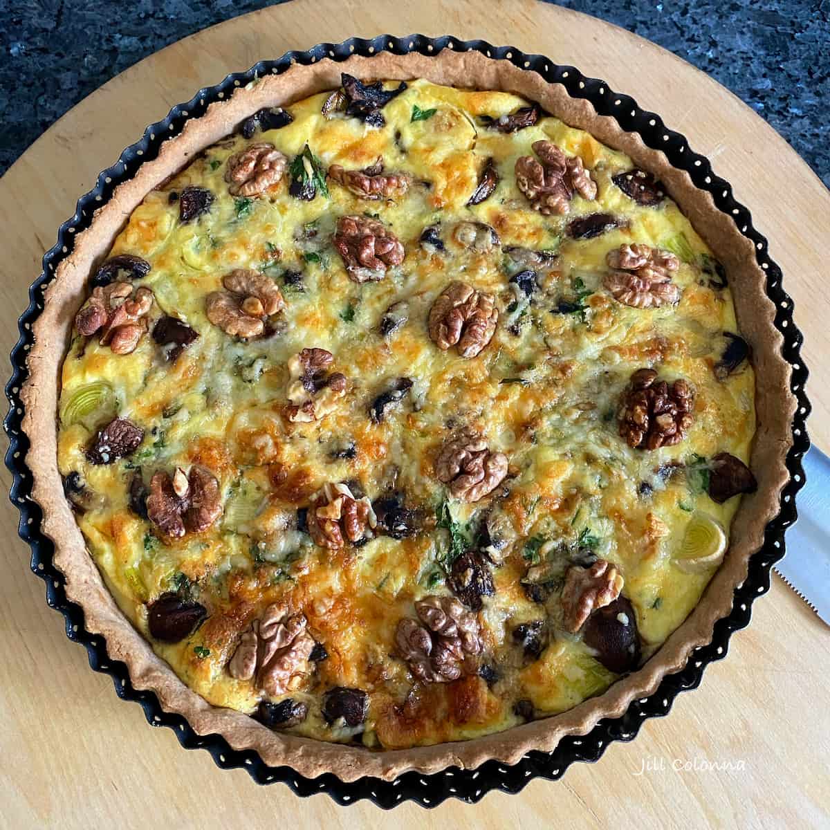 A savory pumpkin tart us taken to the next level with a French twist of mushrooms, sage and chestnut. Go to recipe.