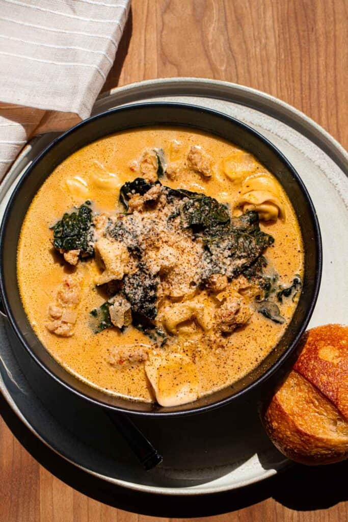 Creamy Sausage Pumpkin Soup with Tortellini and Kale