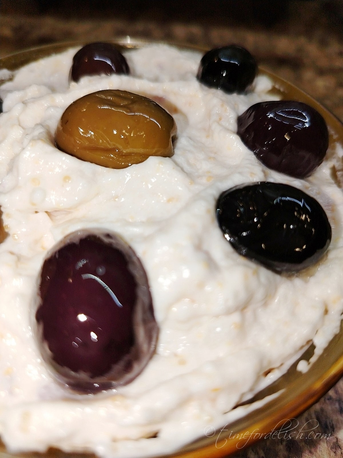 Start adding bits of semolina pudding (already cooled off) to thicken the dip’s texture. Continue mixing adding as much semolina pudding, lemon juice and water as you like for your personal taste.
