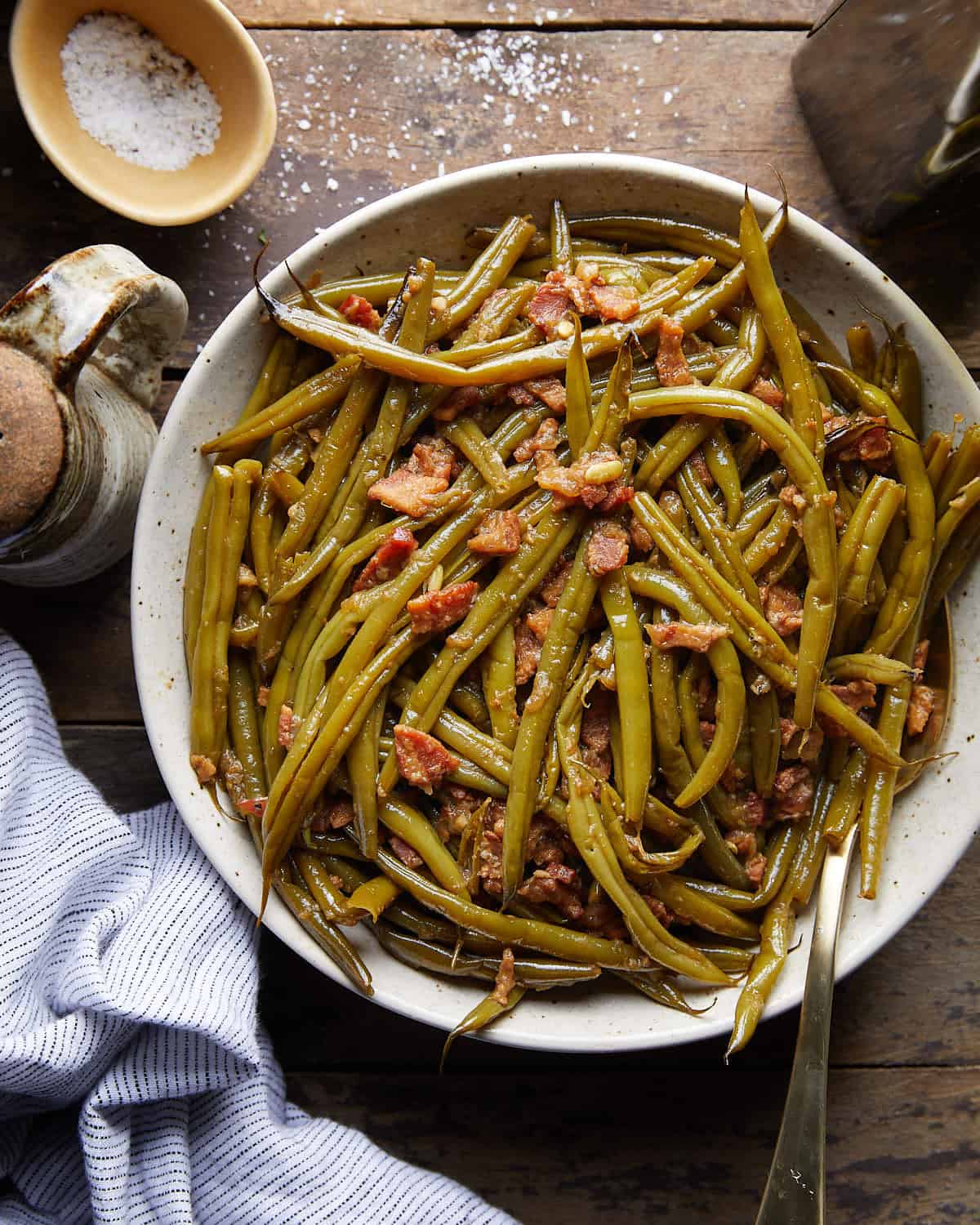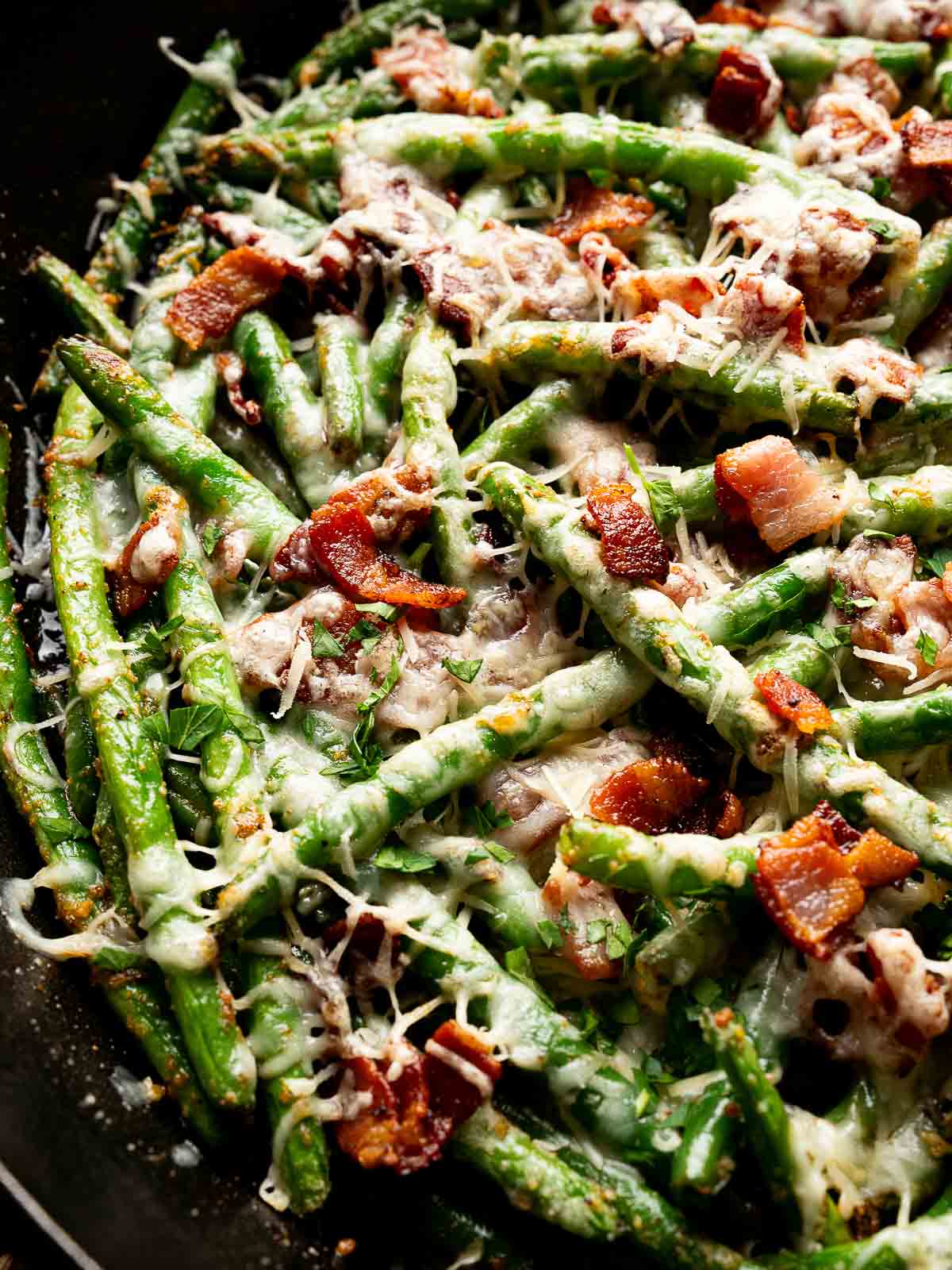 These cheesy green beans with garlic and bacon are a quick one-pan side dish that’s perfect for both weeknight dinners and holidays like Thanksgiving or Christmas.