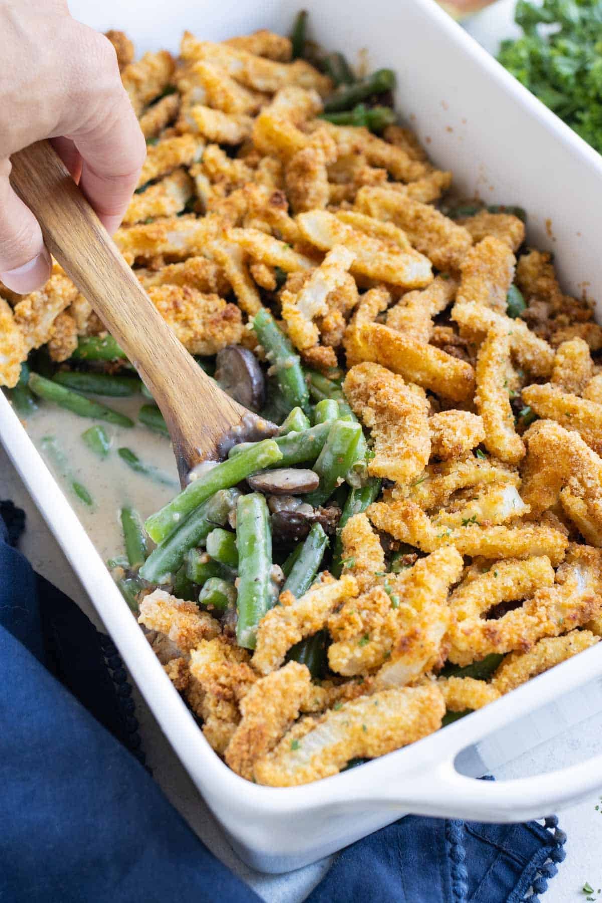This Dairy-Free Green Bean Casserole recipe is so much better than making it with the canned stuff- plus, it’s also secretly gluten-free, too!