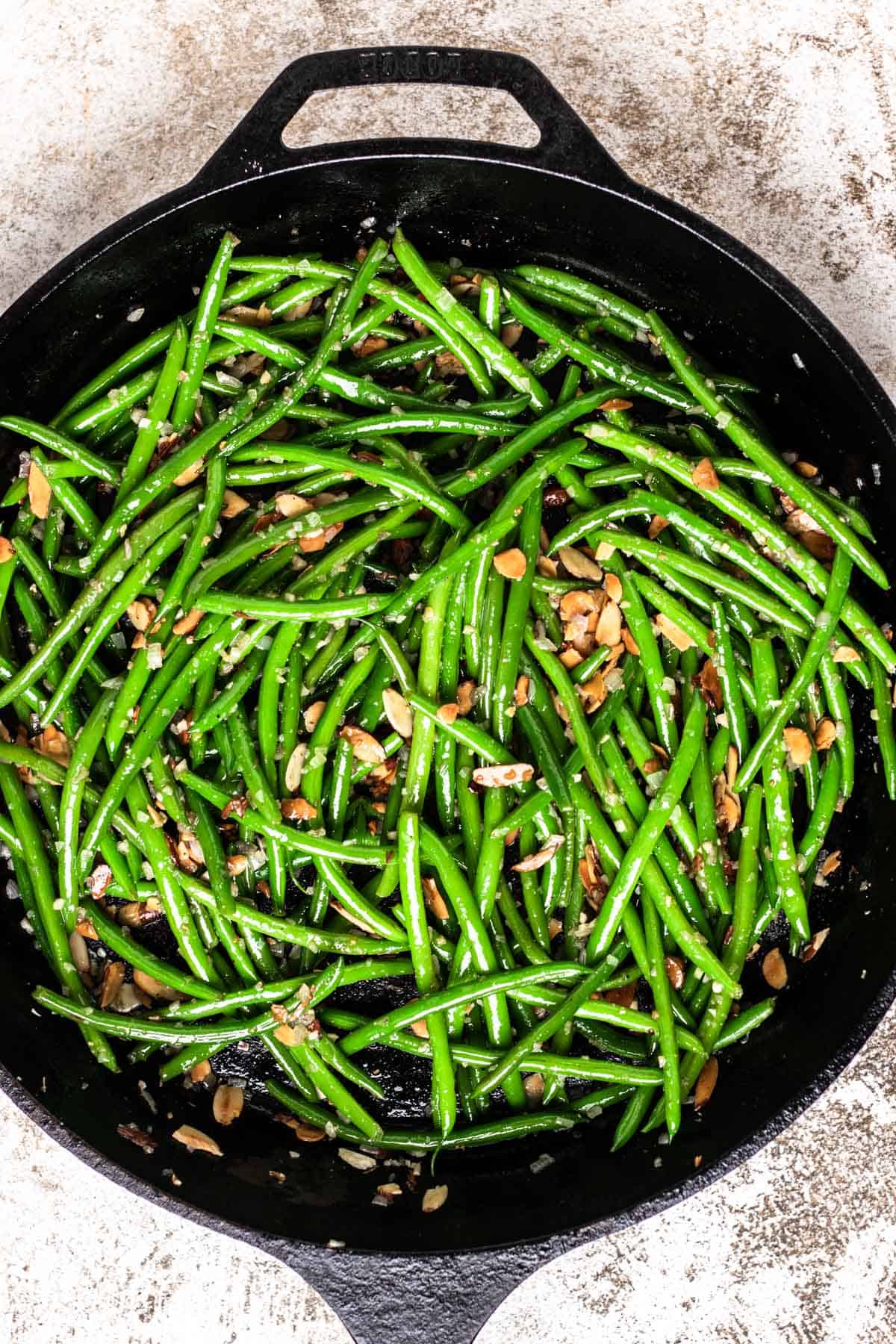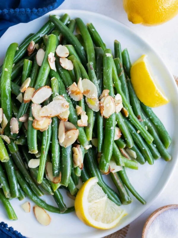 This classic Green Beans Almondine recipe is secretly easy to make (in under 20 minutes!) and has so much flavor! Simply boil and blanch fresh green beans, toss in a lemon and garlic sauce, and serve with slivered almonds.