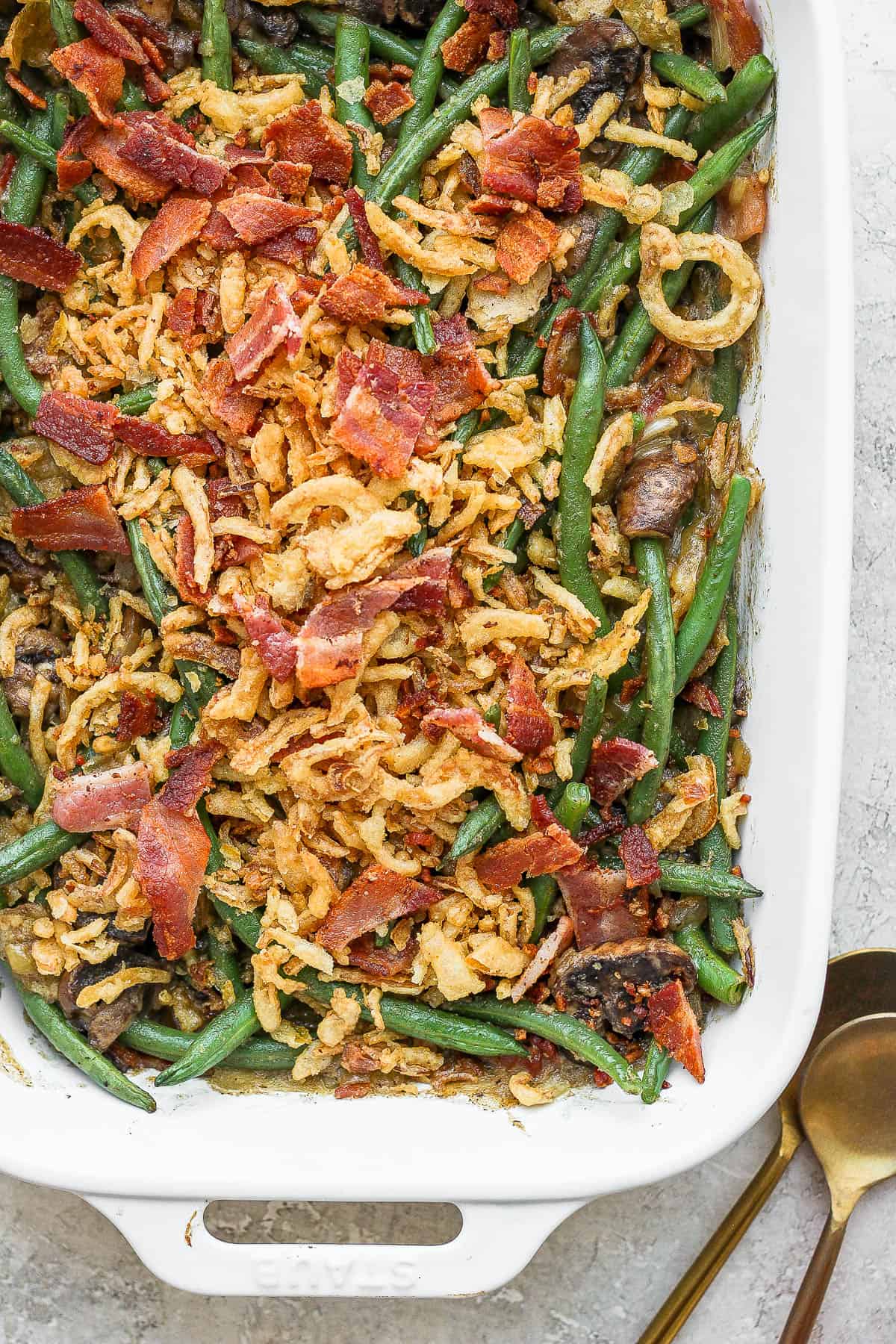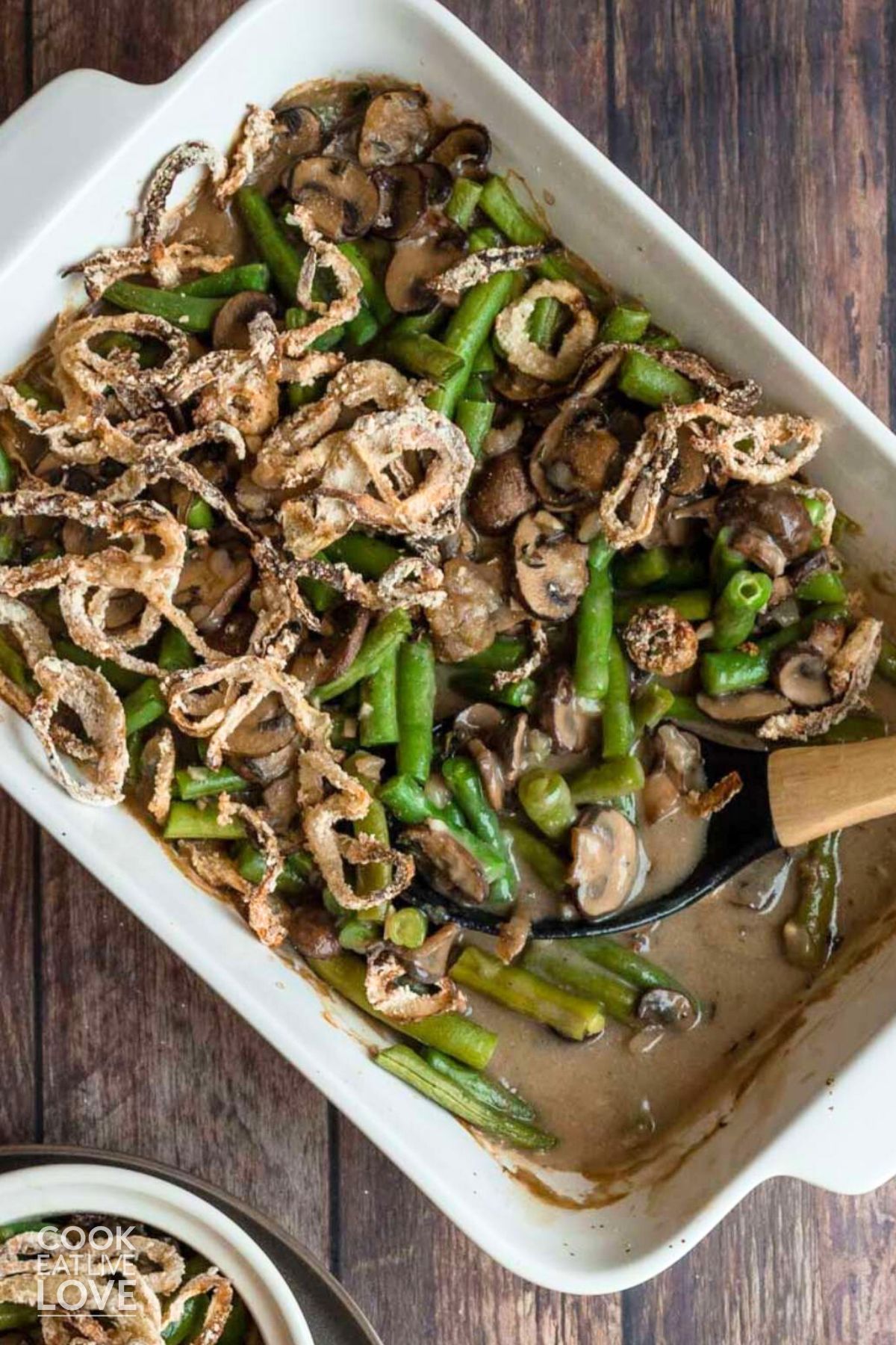 This Green Bean Casserole with Bacon and Mushrooms is a homemade version of the classic. It is made without any canned cream of mushroom soup.