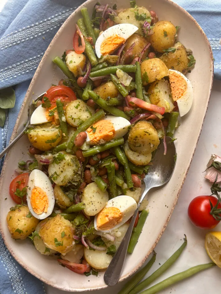 Tender new potatoes, crisp green beans, juicy cherry tomatoes, and creamy borlotti beans are tossed with a bright herby pesto dressing and finished with hard-boiled eggs. Go to recipe.