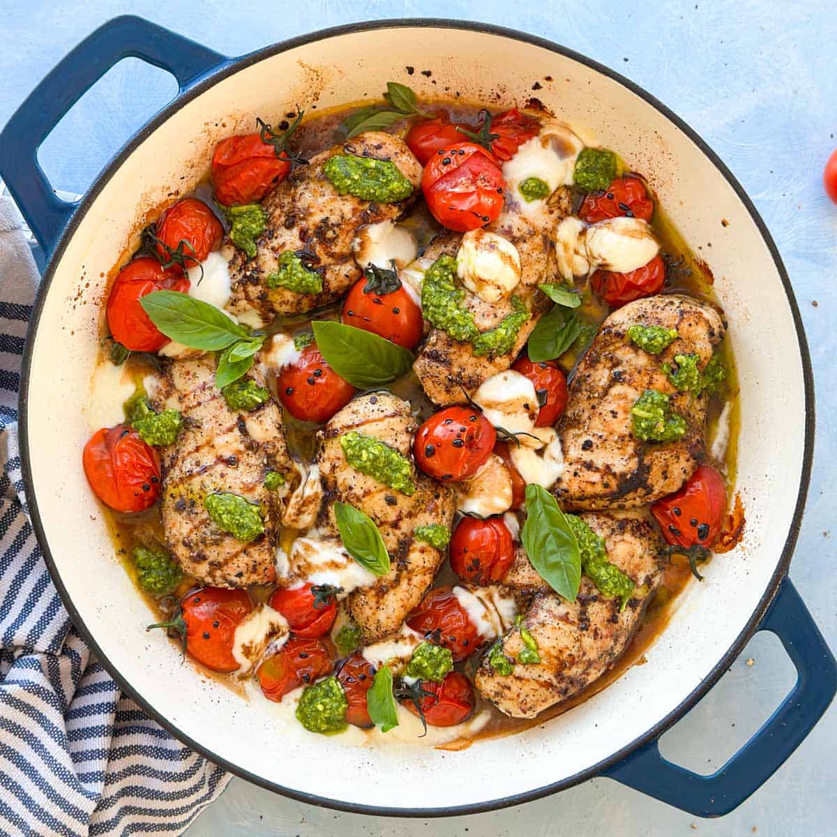 Caprese chicken is a simple and satisfying Italian-inspired dish featuring juicy baked chicken breasts topped with cherry tomatoes, fresh mozzarella, basil pesto, and a drizzle of balsamic glaze. Go to recipe.