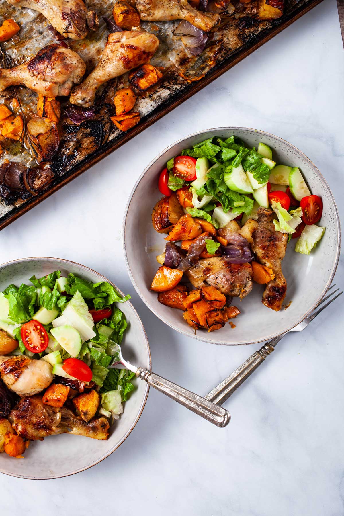 Juicy, crispy baked chicken legs, flavored with aromatic herbs and spices, are nestled on a baking sheet in a bed of sweet potatoes, red onions, and warm fruity apples. Go to recipe.