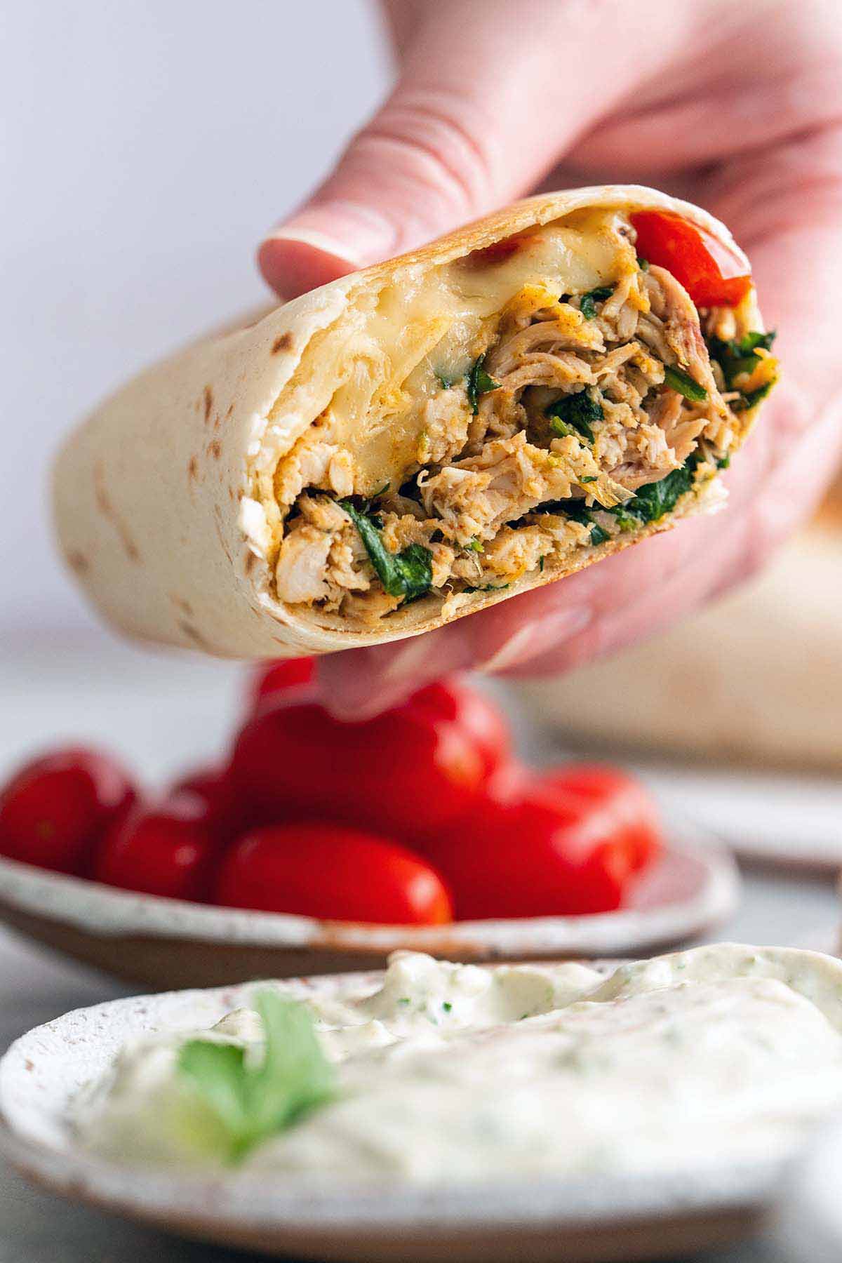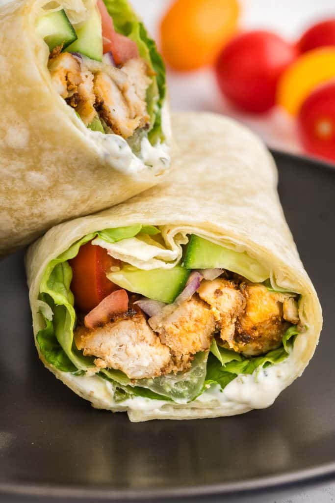 This chicken wrap is a great alternative to a sandwich. Well spiced flavourful chicken wrapped in a flour tortilla with crunchy lettuce, red onion, cucumber, soft sweet tomatoes, and a smooth punchy ranch dressing. Go to recipe.
