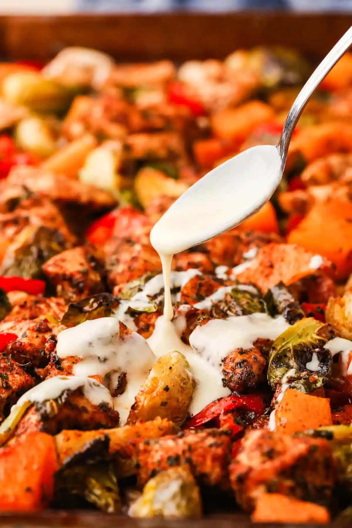 Pieces of juicy chicken breasts roasts alongside caramelized butternut squash, brussel sprouts, and red bell peppers. It’s seasoned with my homemade All Purpose Seasoning and a drizzle of greek yogurt honey mustard glaze.