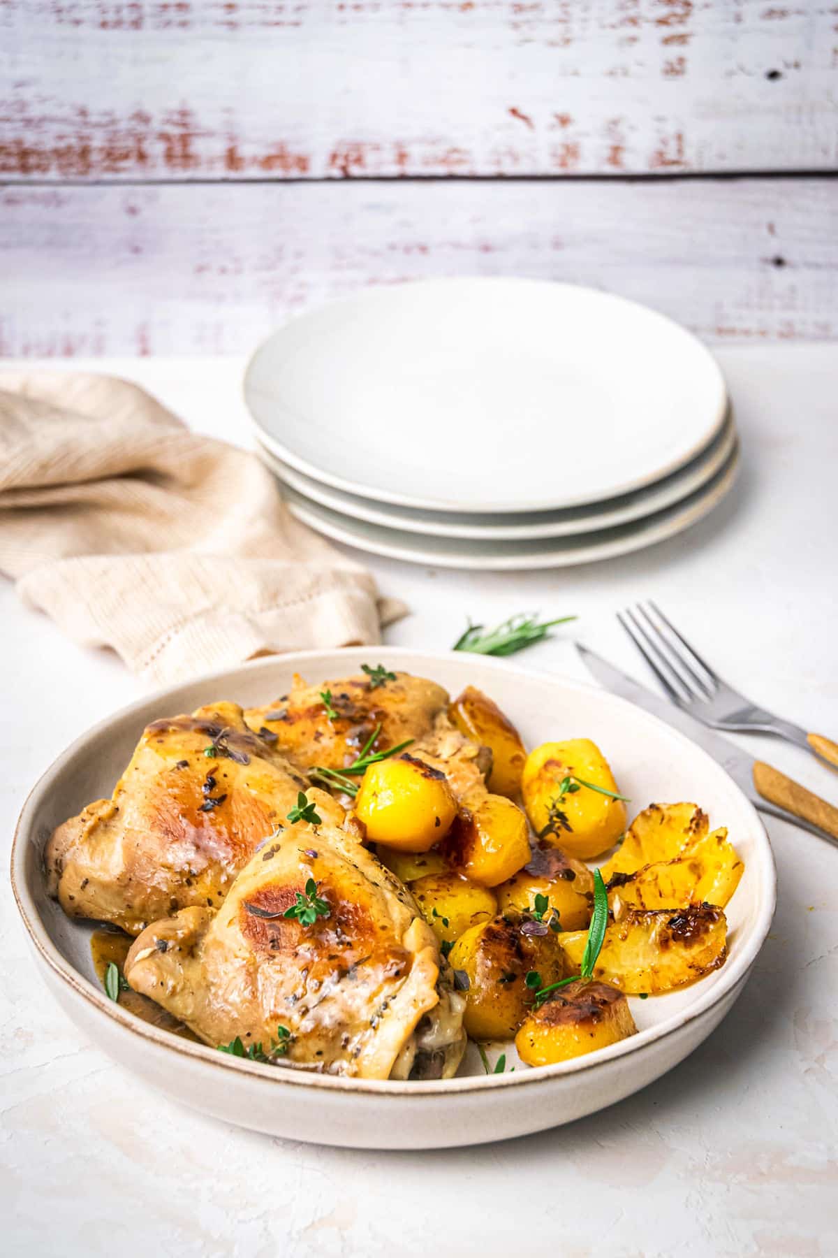 Juicy, golden-crisp chicken thighs and tender, baby potatoes are seared and then cooked in chicken broth with fragrant herbs. Go to recipe.