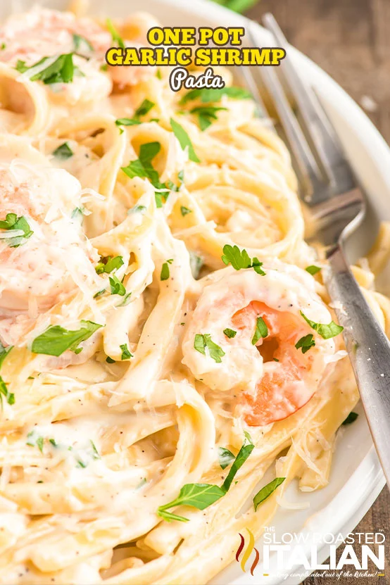 One Pot Creamy Garlic Shrimp Pasta is rich, velvety and loaded with tender shrimp wrapped in a smooth garlic sauce.