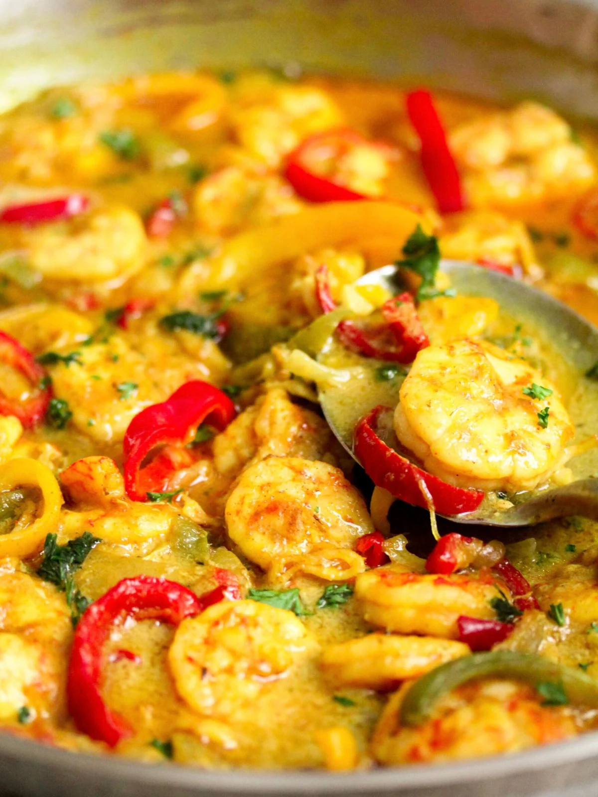 This mouth-watering Easy Jamaican Curry Shrimp is bright, fresh and delicious! It includes large fresh shrimp, curry powder, capsicum peppers, onions, coconut milk and thyme.