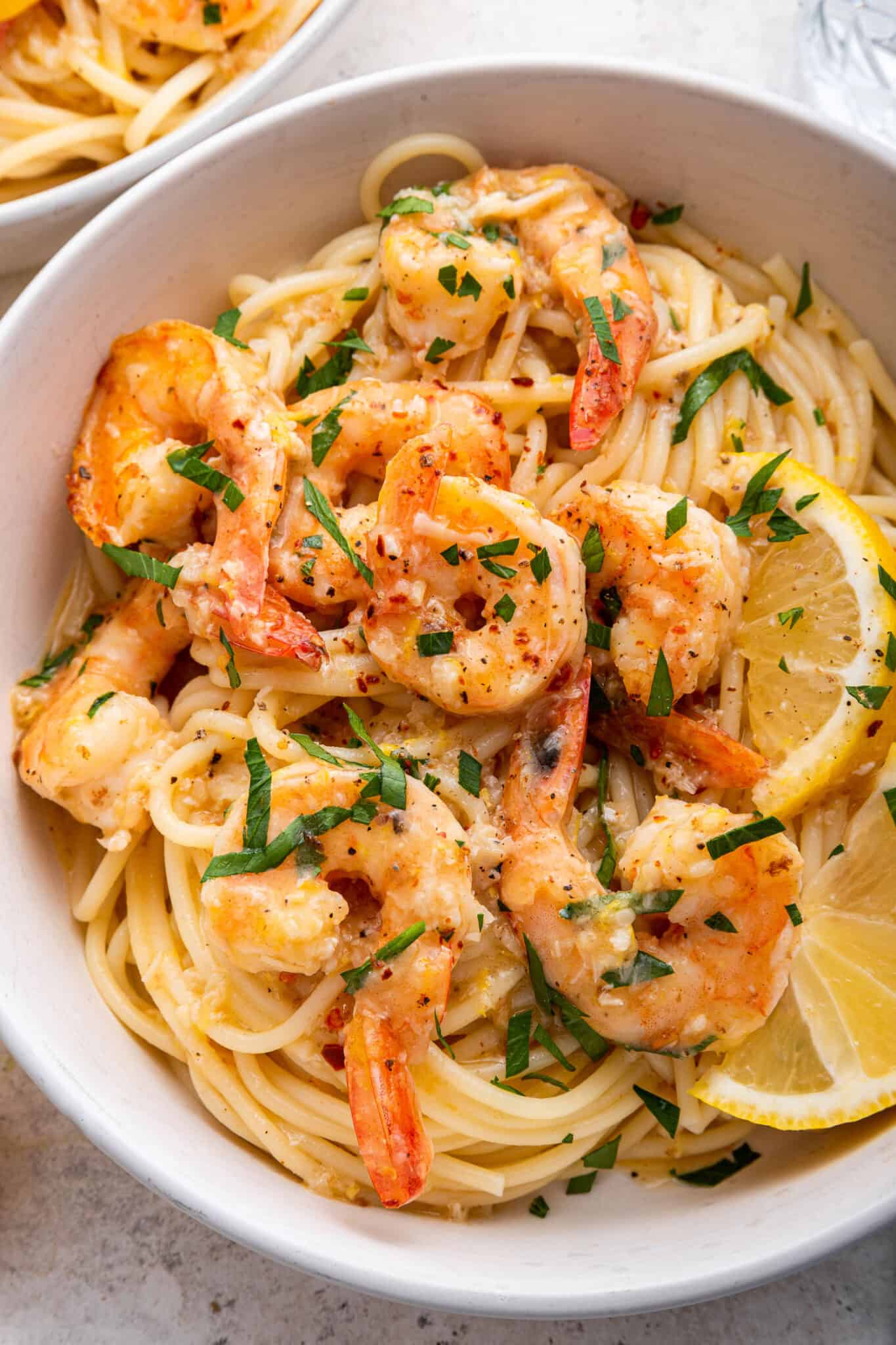 This shrimp scampi is A seafood dish made with garlic, butter, shrimp, and topped with parmesan cheese and a squeeze of lemon.