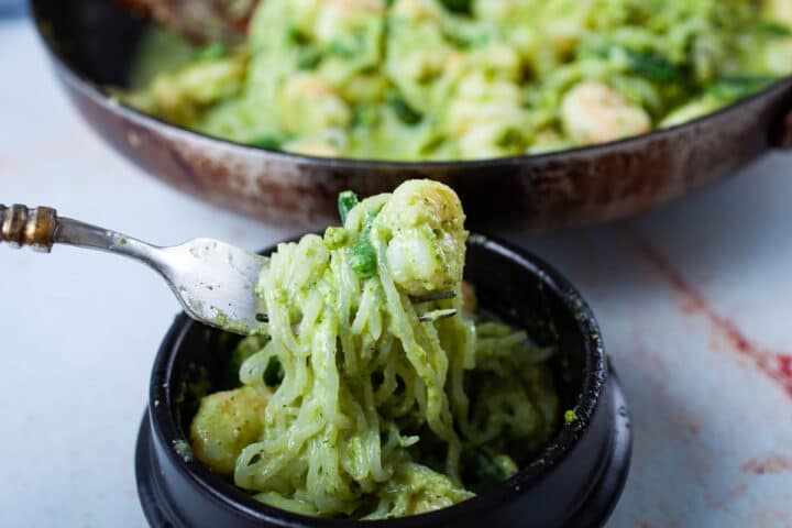 Low Carb Noodles with Shrimp & Garlicky Cashew Pesto