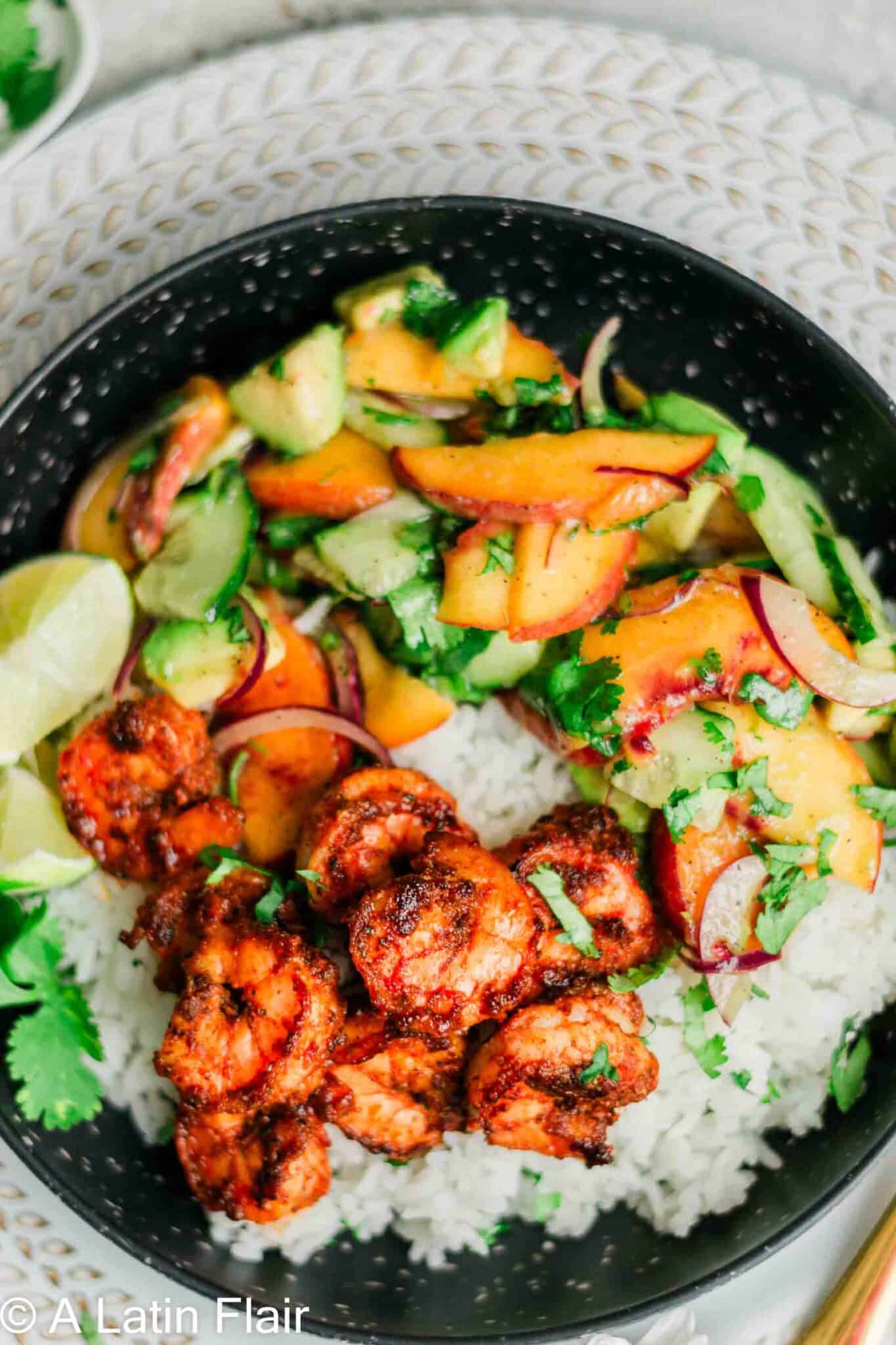 Spicy Shrimp Bowl Recipe with Rice and Peach Avocado Salad (Under 30 minutes!)