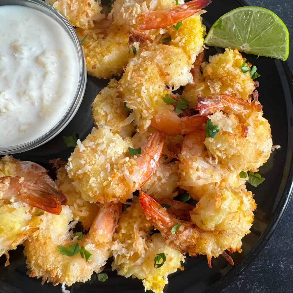 My air fryer coconut shrimp recipe has a touch of natural sweetness from coconut, and a slightly crunchy crisp coating. You’re also getting my recipe for the best dip for coconut shrimp you’ve ever had, a sweet pineapple dipping sauce.