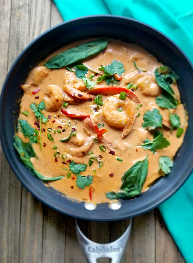 Peanut Coconut Curry Shrimp tastes like a dream! Made with peanut milk and coconut milk topped with fresh basil and cilantro. It tastes like comfort in a bowl.