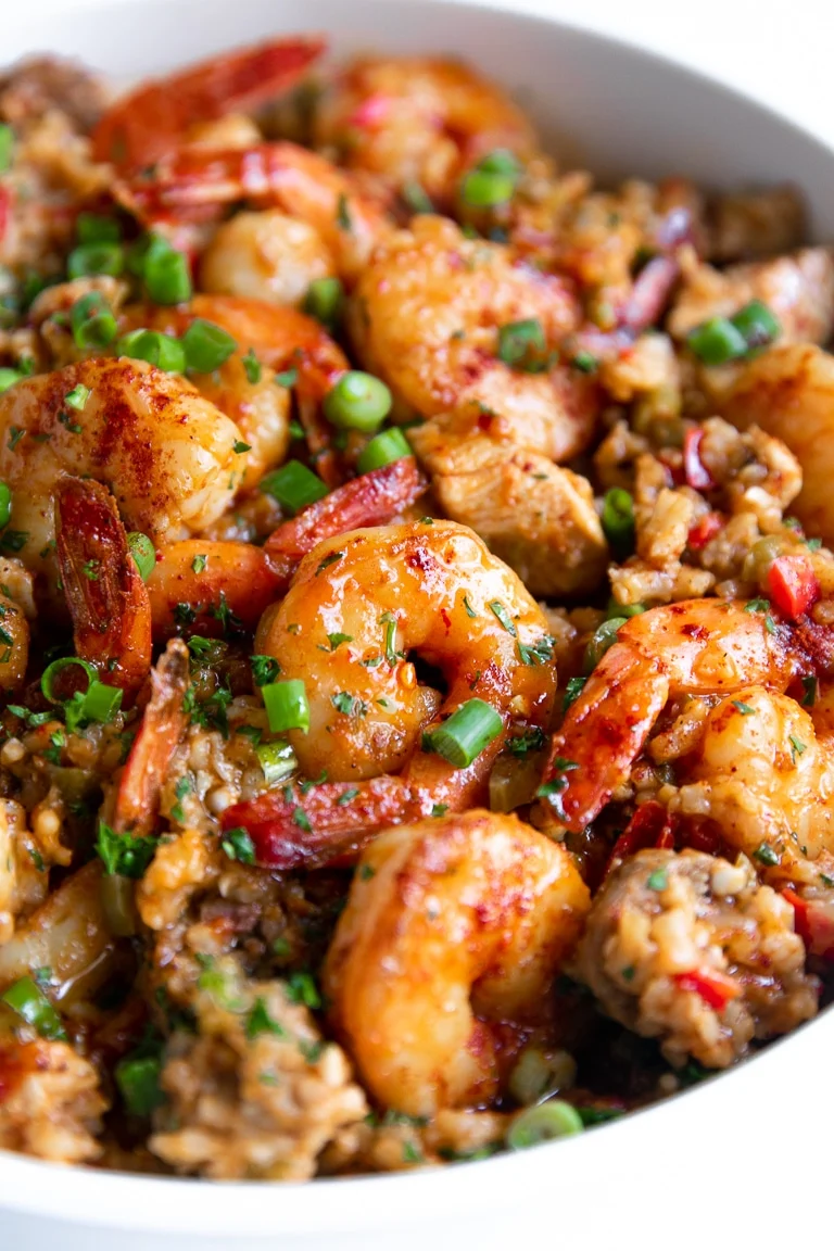 This easy one-pot jambalaya is loaded with juicy shrimp, spicy andouille, and tender rice, delivering bold, rich Cajun flavor in every bite.